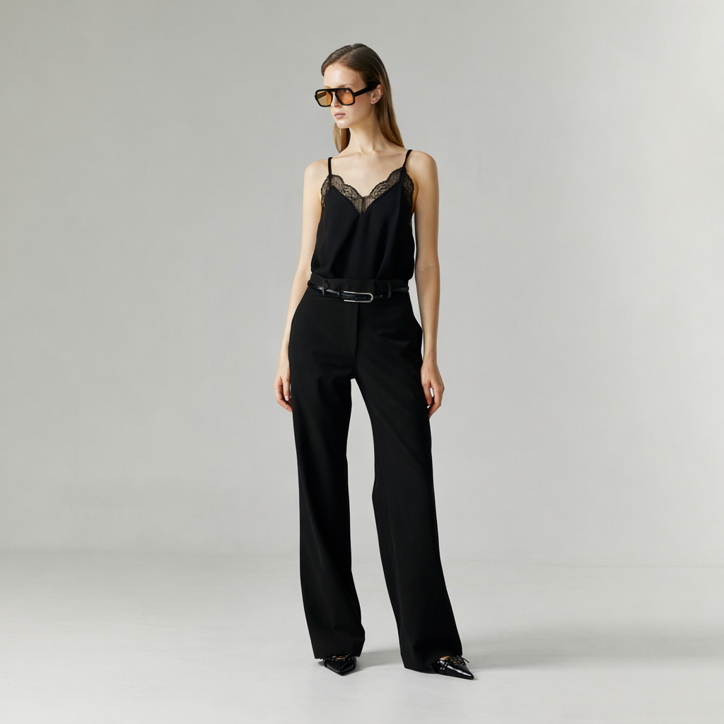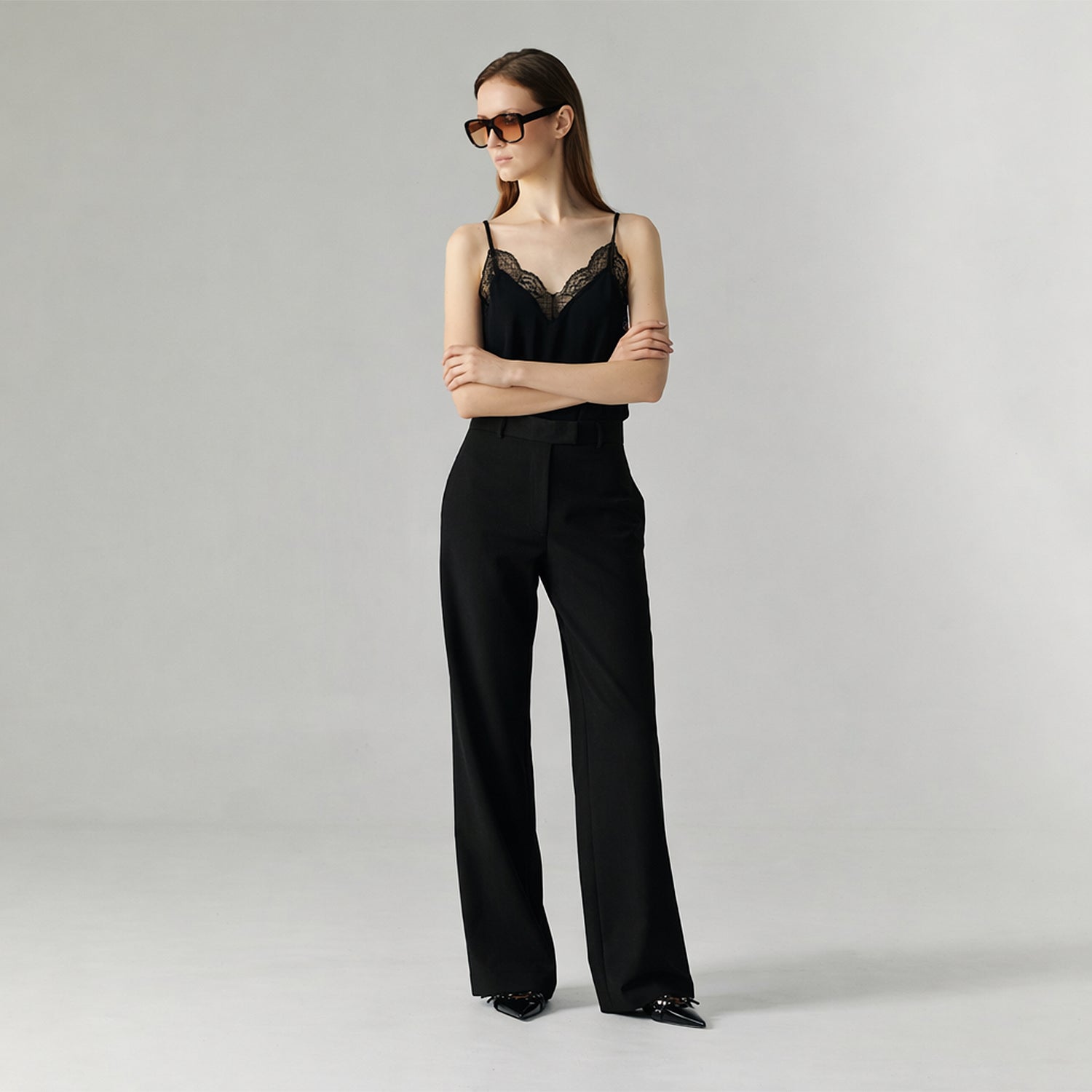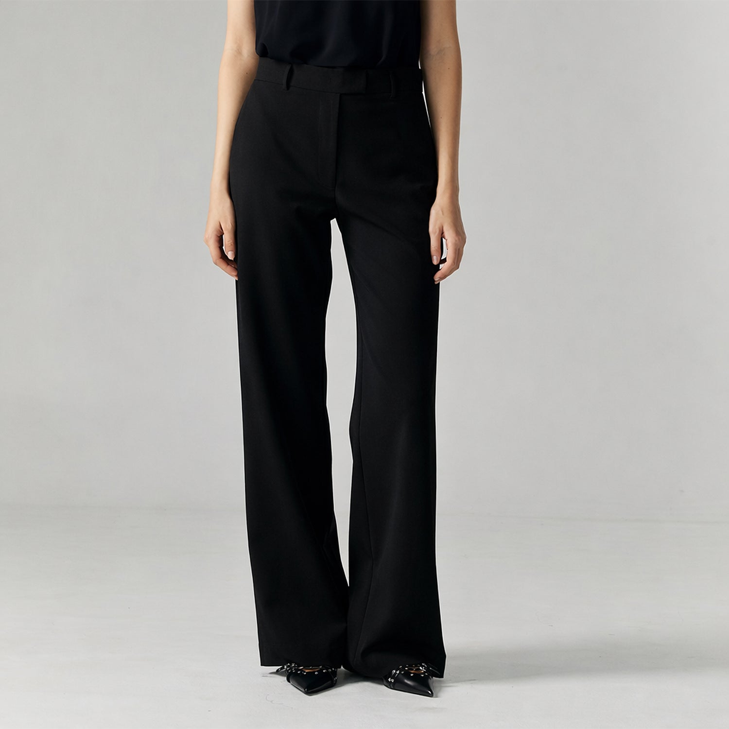 Tailored straight-fit trousers crafted from a polyester–wool blend that offers both structure and comfort. The fabric drapes beautifully while maintaining a refined silhouette, perfect for an elegant yet effortless look. Easily styled with romantic blouses, lace tops, or a structured blazer for a sophisticated everyday ensemble.