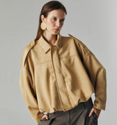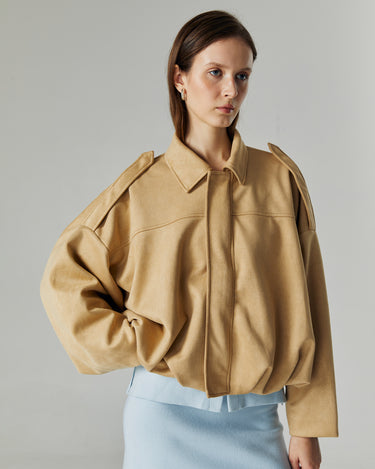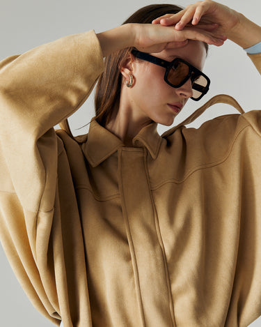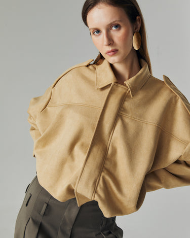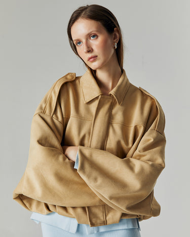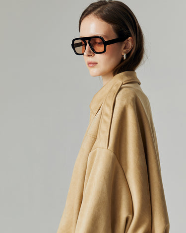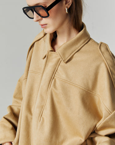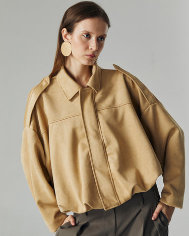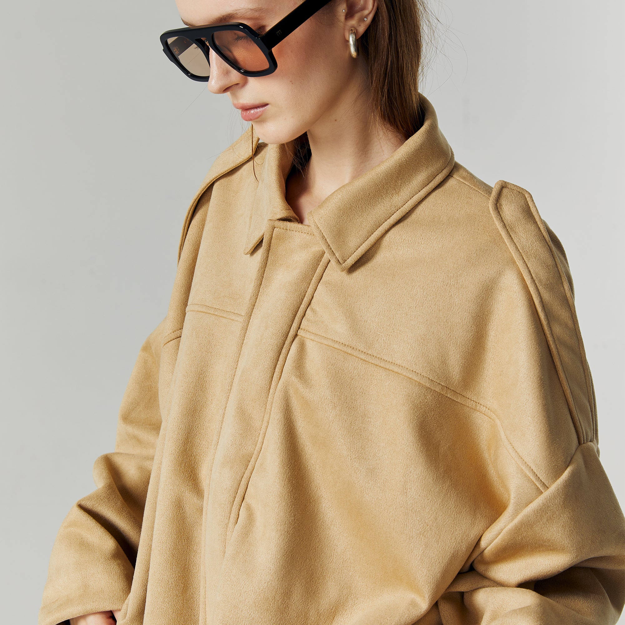 The Qiana Suede Jacket features a relaxed silhouette with structured shoulders and clean tailoring, creating a refined yet effortless look. Crafted from soft suede-like material with windproof and anti-wrinkle properties, it offers both durability and elevated comfort while maintaining a smooth, polished finish. Perfect for layering over a fitted dress or pairing with Xean Quilted Shorts for a contemporary casual look. Complete the outfit with bold hoop earrings or structured accessories for a sophisticated finish.