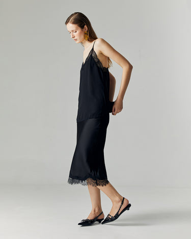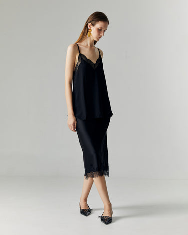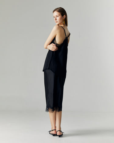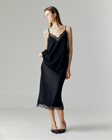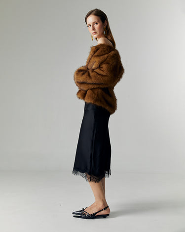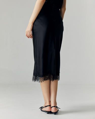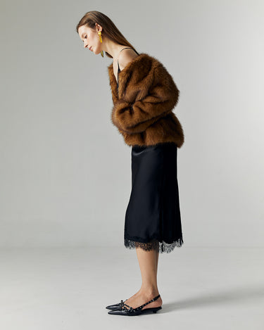 The Althea Satin Lace Skirt embodies timeless elegance with its smooth satin texture and delicate lace hem. Designed to flatter the silhouette, this skirt transitions seamlessly from day to night — perfect for both refined workwear and evening occasions. Style it with a fitted blouse or the Qiana Suede Jacket for a sophisticated yet effortless look.